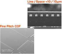 FLEXCEED realized production of COF with 18um pitch routing for large LCD panels and smartphone in 2020. Moreover, fine pitch technologies for the COF with 16um pitch or less is under development.